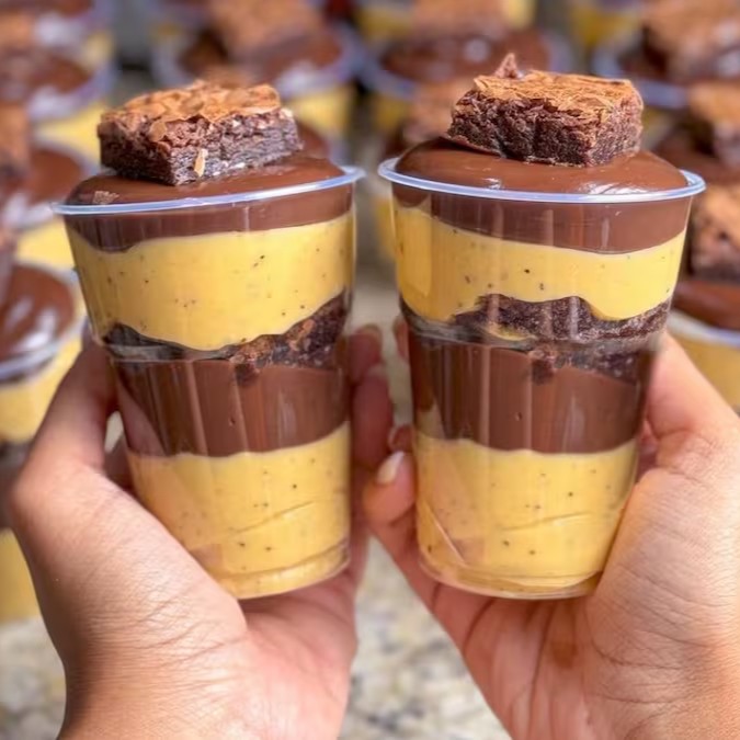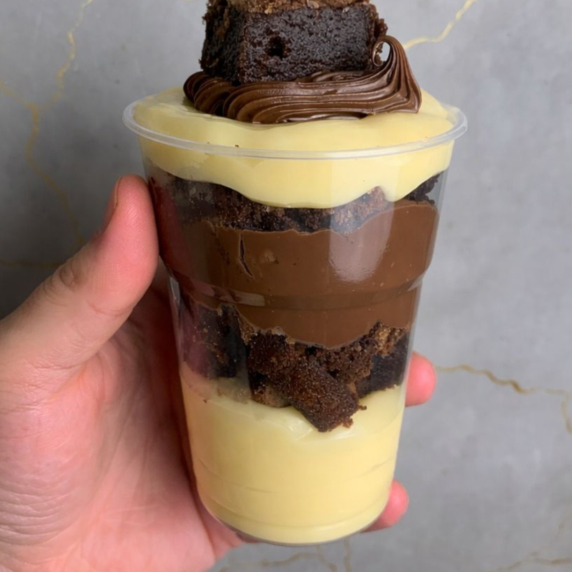 Copo da felicidade com a combinação mais amada do Brasil. Composto por camadas de brigadeiro ao leite, brigadeiro de Ninho, Nutella pura, pedaços de brownie super chocolatudo e molhadinho. Finalizado com Nutella purinha e brownie.