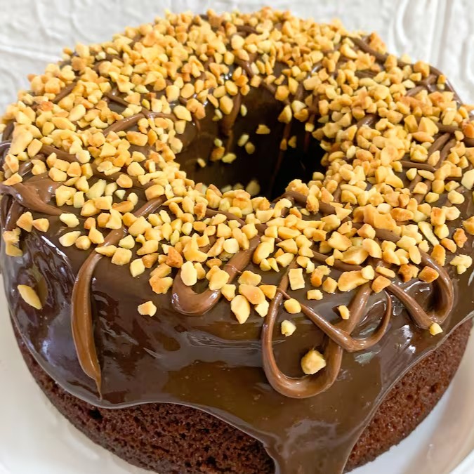 Bolo caseiro com massa de chocolate extremamente fofinha e saborosa, que derrete na boca, feita com chocolate 50% de cacau. Cobertura de brigadeiro cremoso feito com chocolate nobre, e cobertura extra cremosa de Ninho. Finalizado com fios de Nutella Original pura e amendoim triturado.