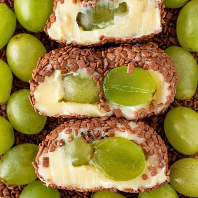 Delicioso Bombomzão de uvas composto por nosso delicioso brigadeiro branquinho, uvas verdes sem semente. Finalizado com granulado de chocolate nobre. Uma sobremesa simplesmente perfeita.