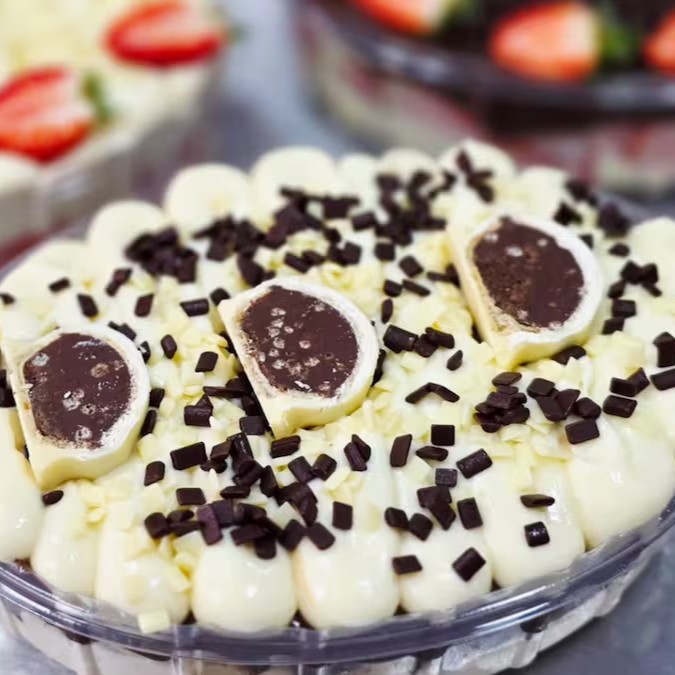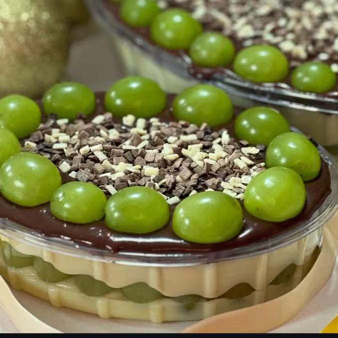 Composta por uvas frescas picadas, delicioso recheio cremoso de leite em pó e recheio de chocolate 50% cacau bem cremoso e brilhante, pedaços de brownie molhadinho e chocolatudo Finalizado com granulado de chocolate nobre e uvas para decorar.