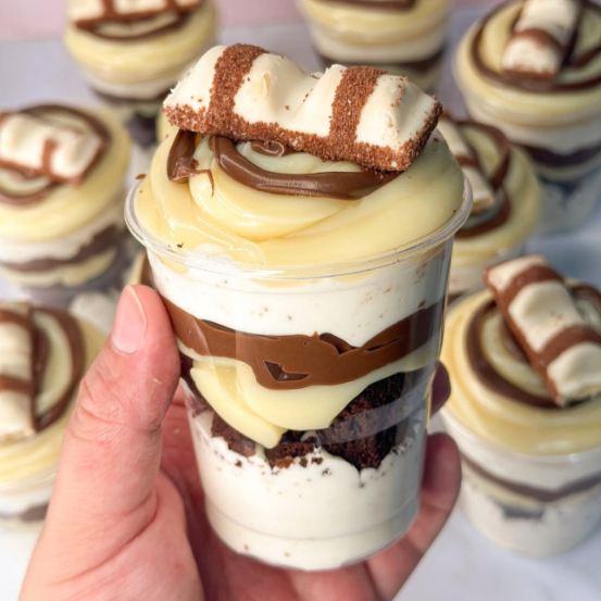 Copo da felicidade composto por camadas de brigadeiro de Ninho bem cremoso, brigadeiro ao leite, Nutella pura, pedaços de brownie, mouse de Ninho. Finalizado com Kinder bueno