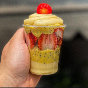 Delicioso copo super refrescante composto por nosso delicioso mousse de maracujá feito com a fruta e chocolate branco, brigadeiro cremoso de Ninho e morangos frescos picados. Copo 200ml.
