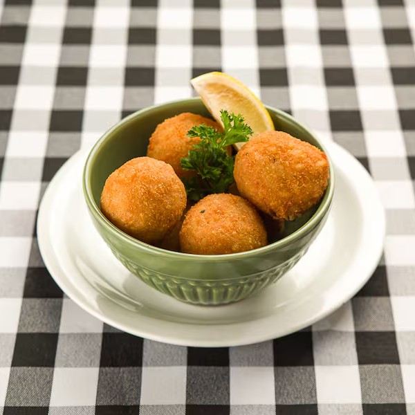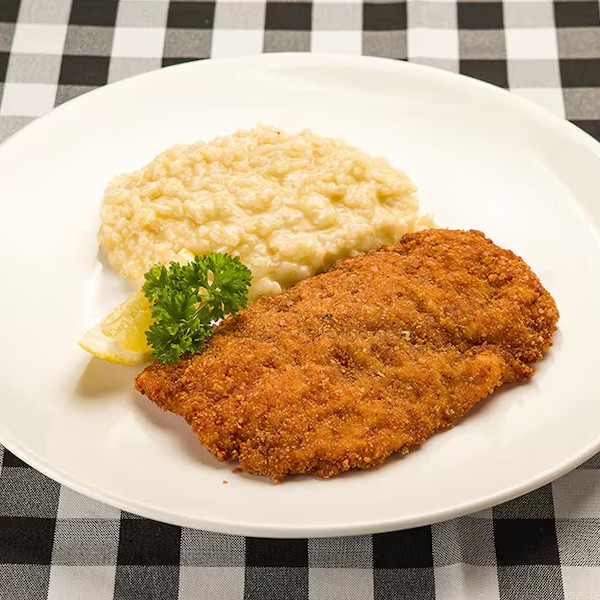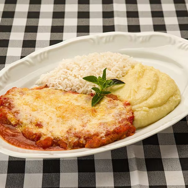 Frango à parmegiana com arroz branco e purê de batatas. Serve 2 pessoas.