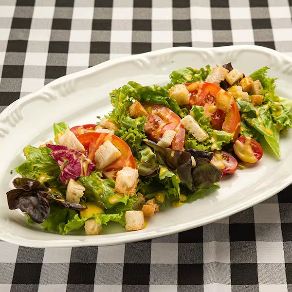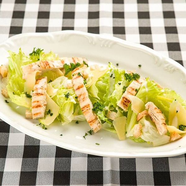 Alface americana, molho cremoso de parmesão e alho, peito de frango em tiras e croutons de pão