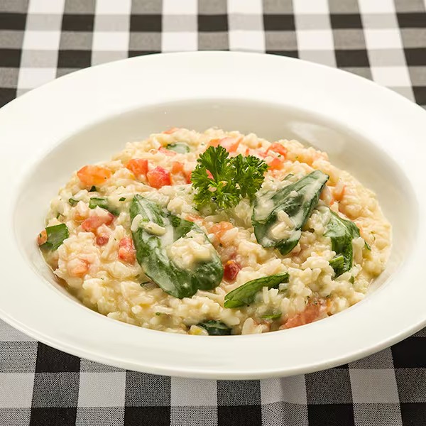 Arroz carnaroli, tomates frescos, queijo parmesão e rúcula
