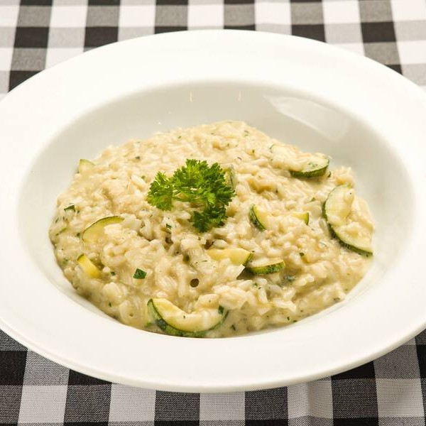 Arroz carnaroli, queijo gorgonzola e abobrinhas ao alho e óleo