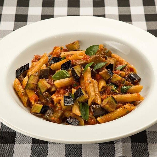 Penne com nosso molho de tomates caseiro, berinjelas salteadas ao alho e azeite virgem