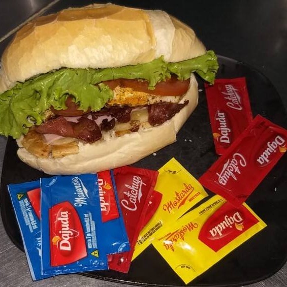 Maravilhoso Lanche de Churrasco completo no Pão francês com Contra filé, Mussarela, Presunto, Ovo, Bacon e Salada
