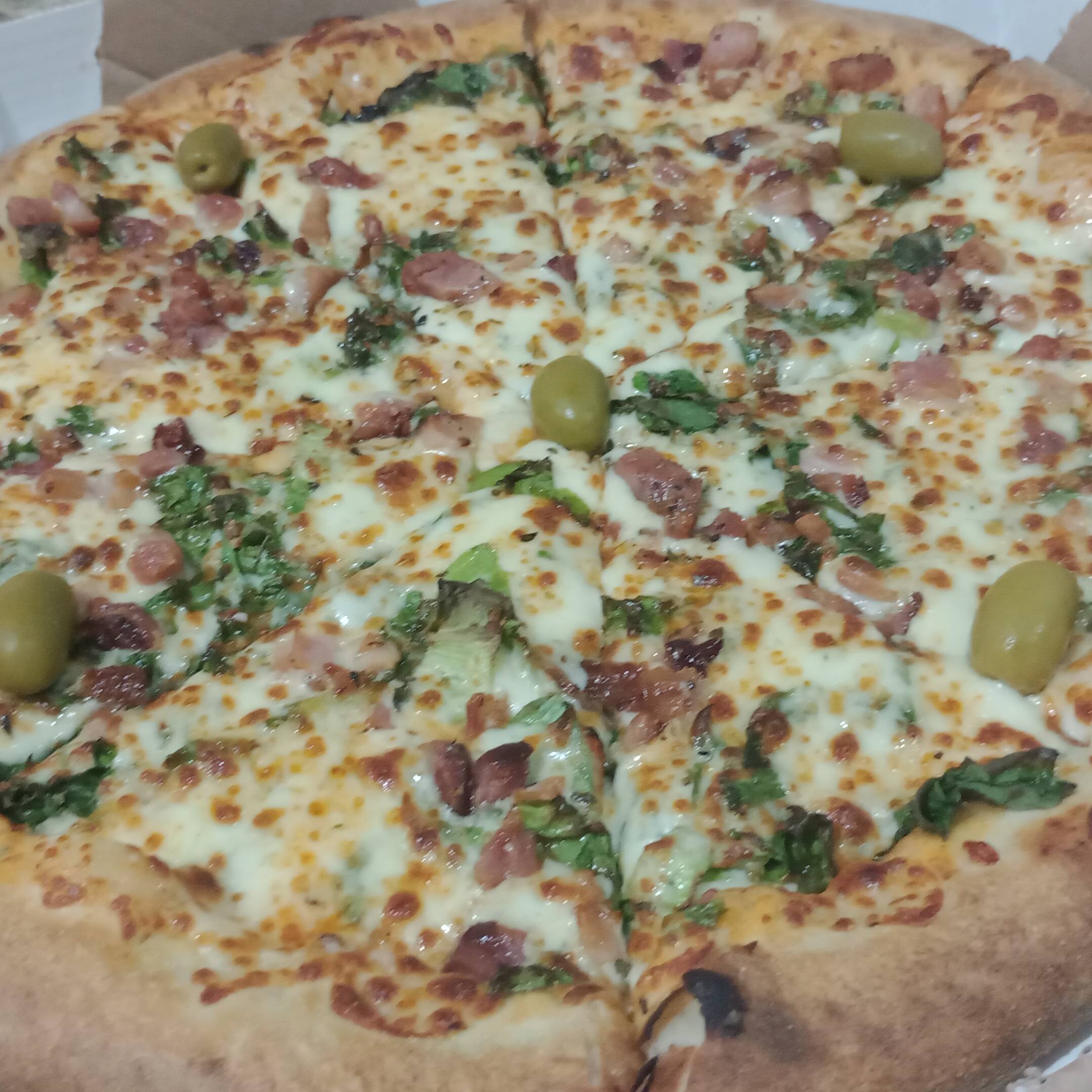 massa de fermentação longa caseira, molho artesanal de fabricação própria da pizza bordão, queijo mussarela três maria, tomate fatiado e finalizado com oréganos e azeitonas.