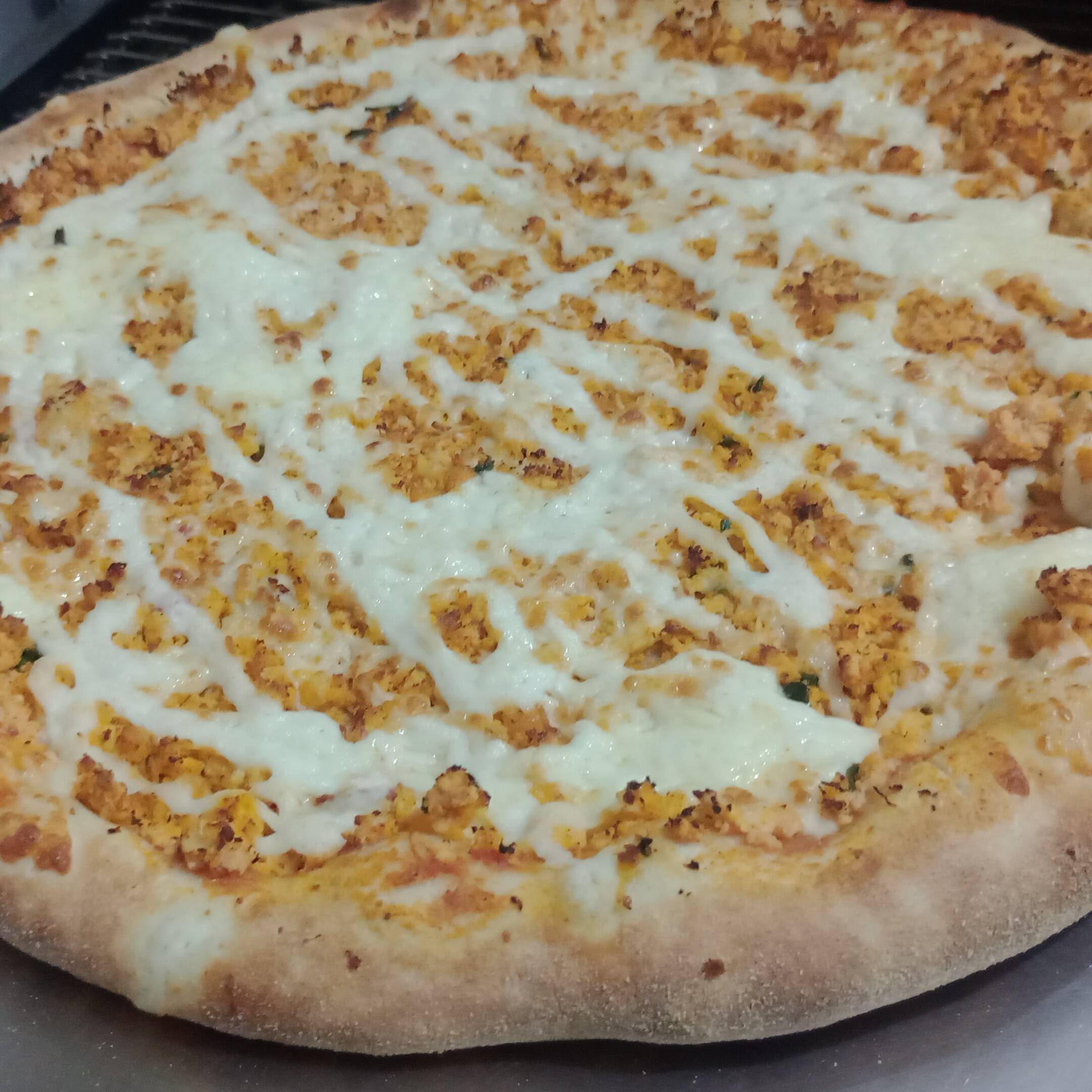 Saborosa pizza com frango desfiado e catupiry ORIGINAL, finalizada com orégano.
