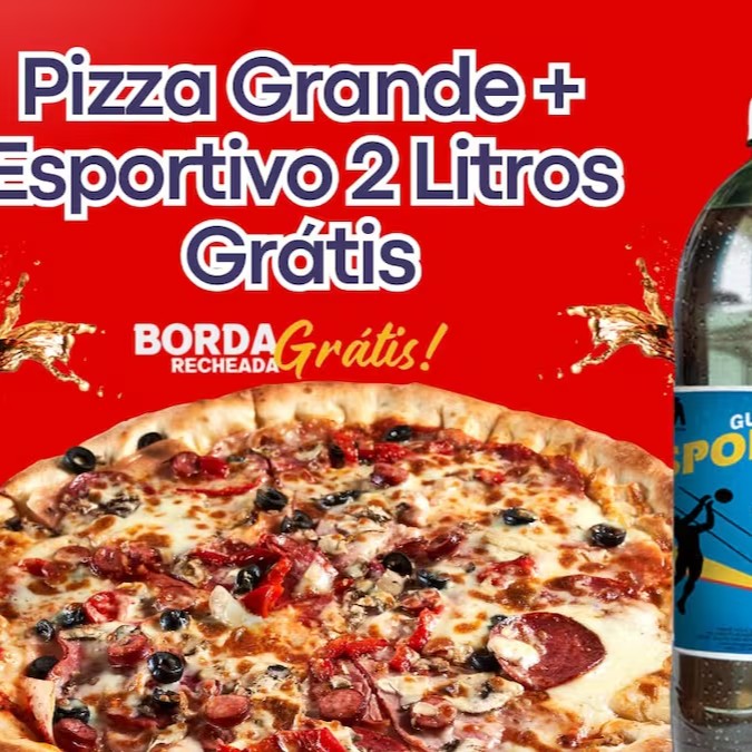 Promoção: peça uma pizza grande e ganhe um esportivo de 2 litros grátis! São mais de 59 opções de sabores para você escolher e se deliciar.