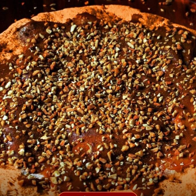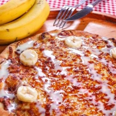 Pizza artesanal, massa média, banana flambada, muçarela, canela, leite condensado e canela. Uma explosão de doçura e sabor.