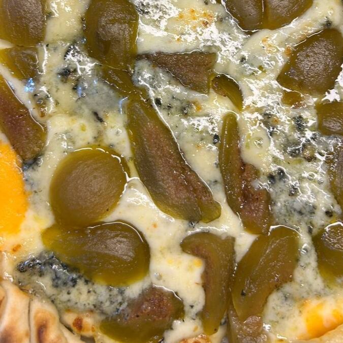 Molho de tomate, muçarela, queijo gorgonzola, figo em caldas, azeitonas sem caroço e orégano.