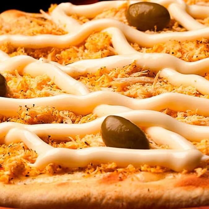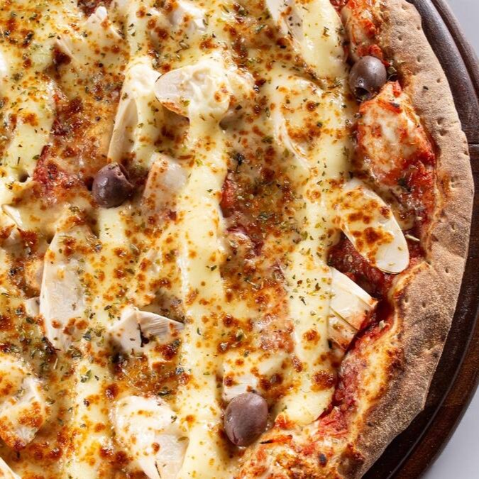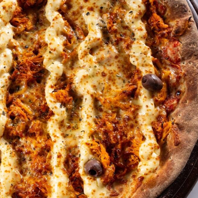 Massa artesanal, molho caseiro, frango temperado, Catupiry Original, mussarela, azeitonas pretas sem caroço e orégano.