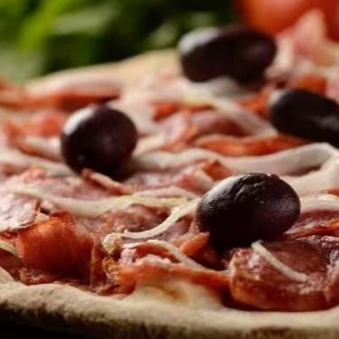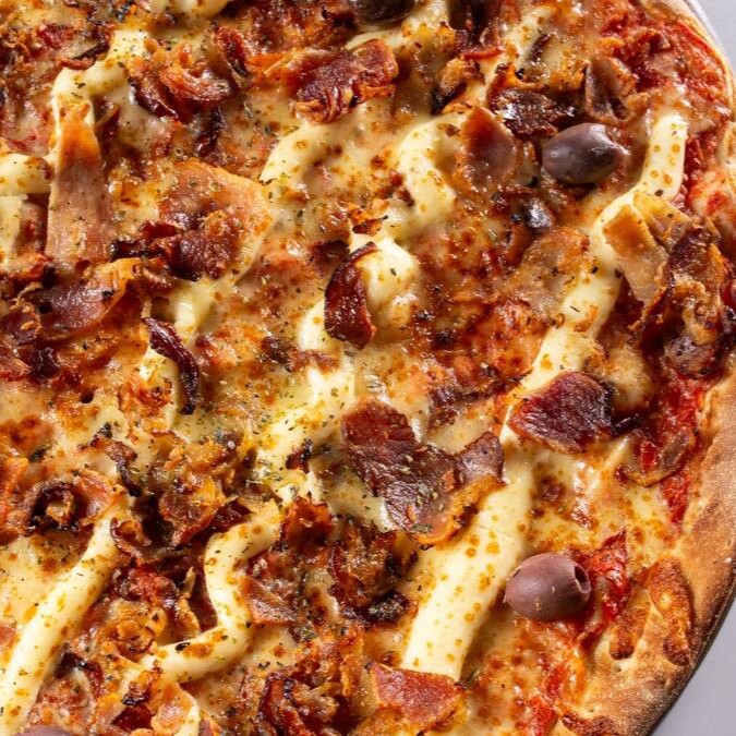 Pizza massa artesanal, molho de tomate caseiro, queijo muçarela Catupiry Original, bacon, azeitonas pretas e orégano.