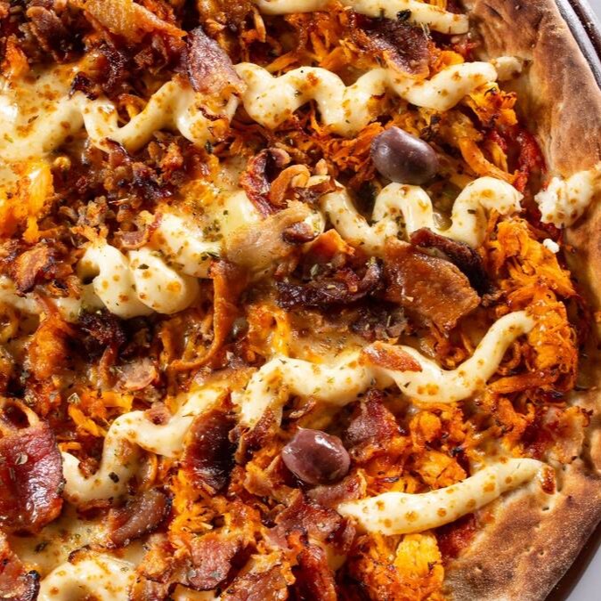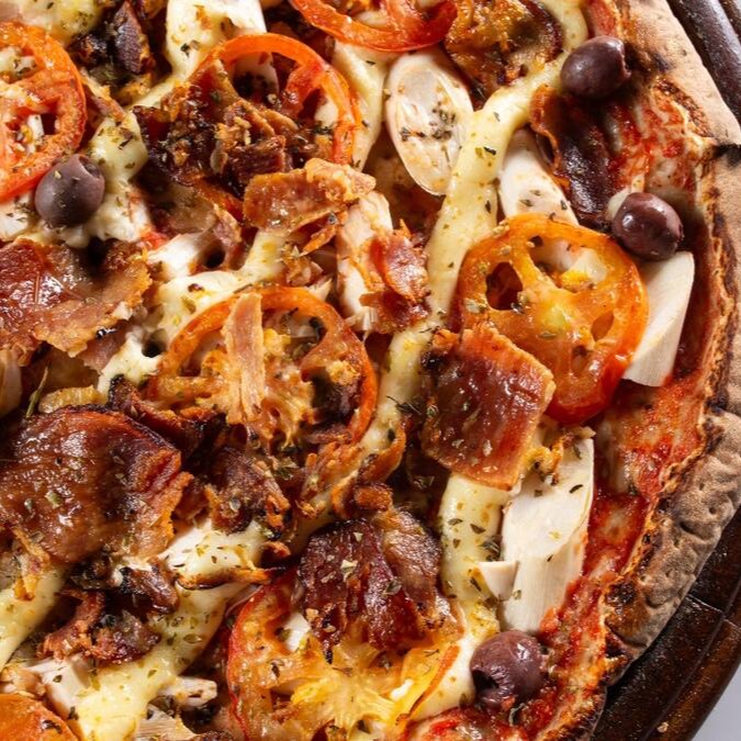 Pizza massa artesanal, molho de tomate caseiro, queijo muçarela, frango, Catupiry Original, bacon, azeitonas pretas e orégano.