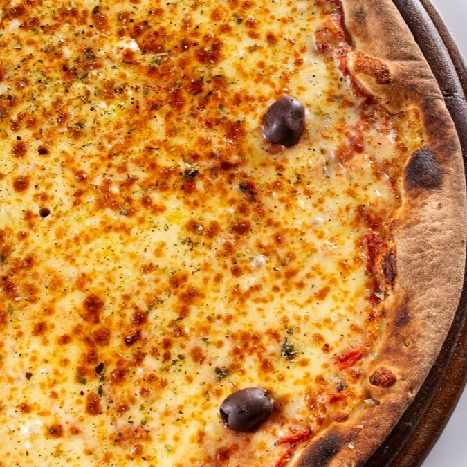Pizza artesanal, molho natural, muçarela, azeitonas pretas e orégano.