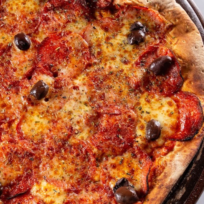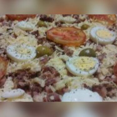 Massa artesanal, molho de tomate natural, mussarela, ovo, tomate, bacon, parmesão, azeitonas e orégano.