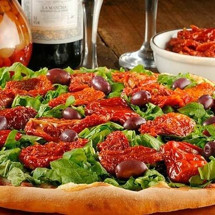 molho de tomate artesanal, mussarela, tomate, parmesão polvilhado, orégano, azeitona