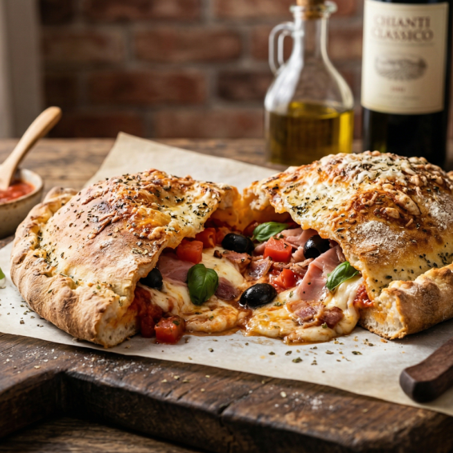 Calzone com molho de tomate artesanal, mussarela, contra filé em tiras, Cheddar, Cebola, Orégano e Azeitonas sem caroço