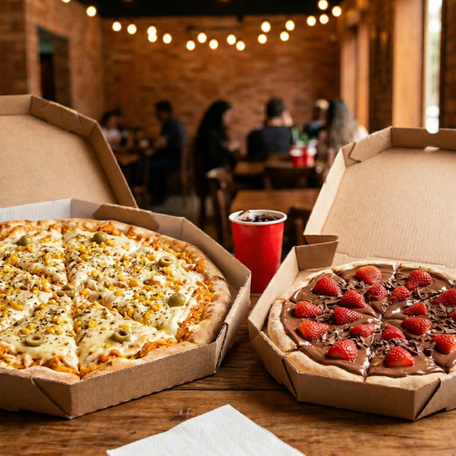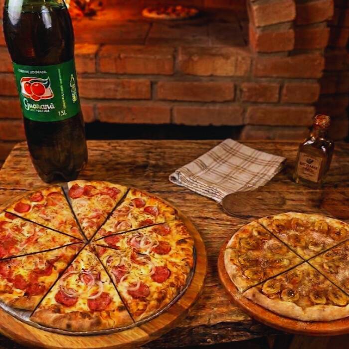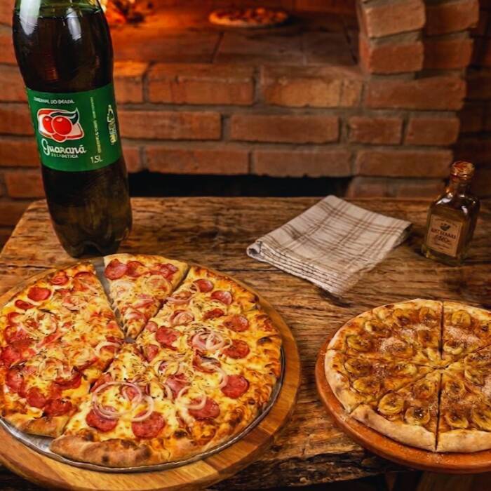 Oferta Imperdível Compre 1 e leve 3! Pizza 8 fatias + Pizza Banana 4 fatias + Refri 1,5l Combinação perfeita de doce e salgado pra seu jantar, almoço ou dividir com a galera Peça agora no ifood e aproveite!