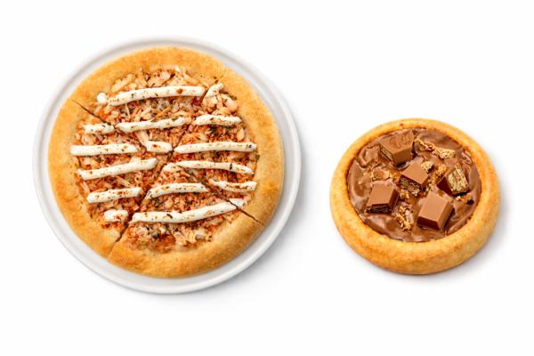 Pizza individual na massa Pan com frango desfiado, requeijão cremoso, orégano e molho de tomate especial Pizza Hut + Slider KitKat.