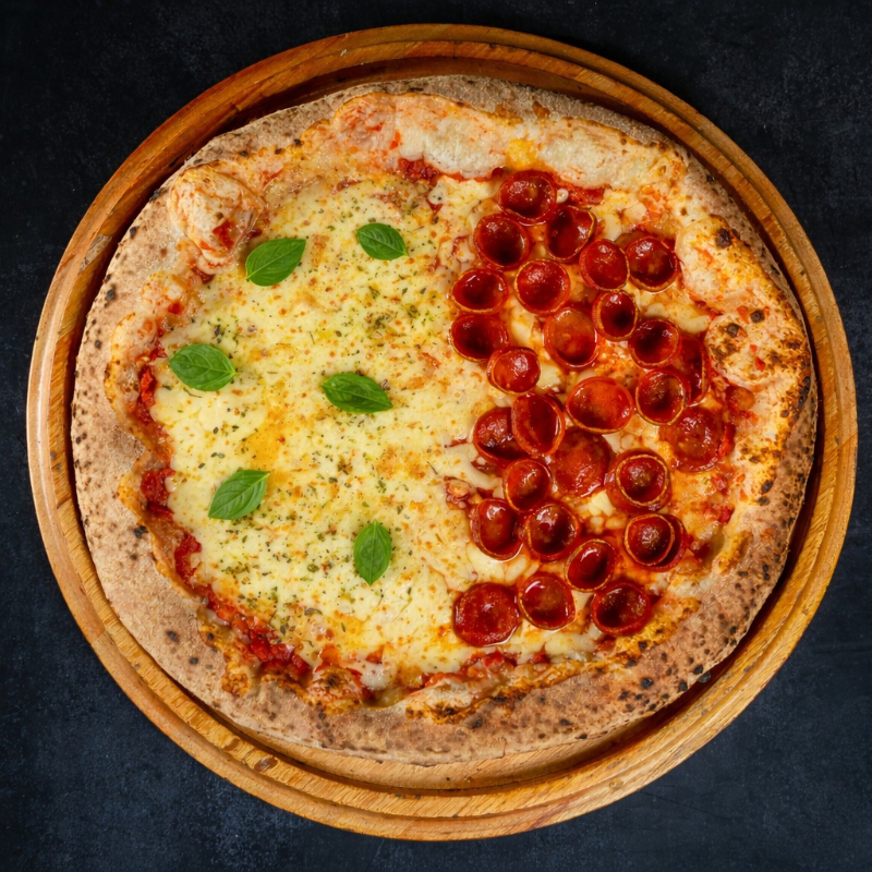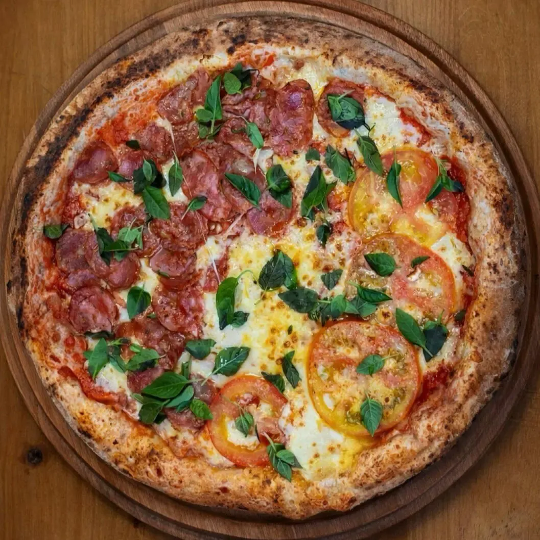 Molho italiano exclusivo La Braciera, mozzarella cremosa e folhas frescas de manjericão que explodem aroma no forno e metade com o mesmo molho e queijo servindo de base para nosso pepperoni especial, que carameliza levemente na borda e entrega aquele equilíbrio perfeito entre gordura, sal e leve picância. Massa de longa fermentação, farinha italiana selecionada e técnica napoletana