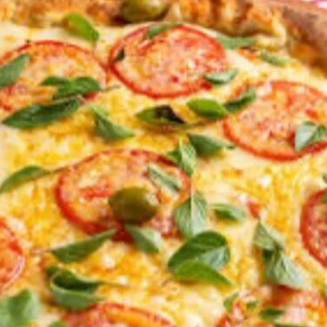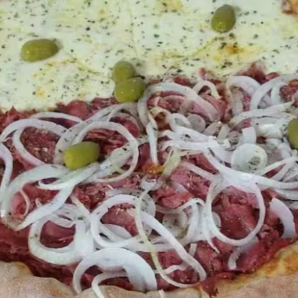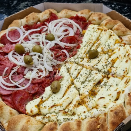 Pizza Grande (8 Fatias) metade Frango (Molho de tomate, frango desfiado, catupiry original, orégano e azeitonas) e metade Calabresa (Molho de tomate, calabresa fatiada, cebola, orégano e azeitonas)