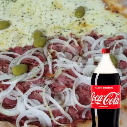 Pizza Grande (8 fatias) metade mussarela (Molho de tomate, queijo mussarela, orégano e azeitonas) e metade calabresa (molho de tomate, calabresa fatiada, cebola, orégano e azeitonas) + 1 Coca Cola 2 Litros.