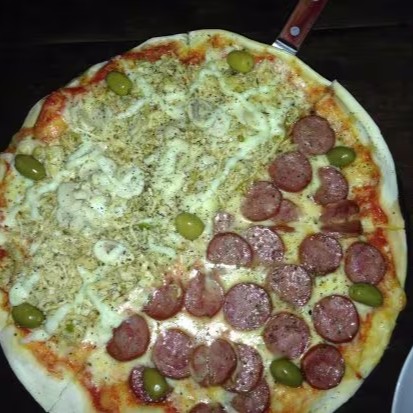 (Molho de tomate artesanal, queijo mussarela derretido, linguiça calabresa defumada, anéis de cebola, orégano e azeitonas selecionadas!) e (molho de tomate artesanal, queijo mussarela derretido, frango desfiado, Catupiry cremoso, orégano e azeitonas selecionadas!) (52 e 29)