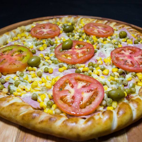 Molho de tomate, mussarela, presunto, milho, ervilha, tomate, orégano e azeitonas*** temos também de 4 e 12 pedaços, desça o cardápio e confira***