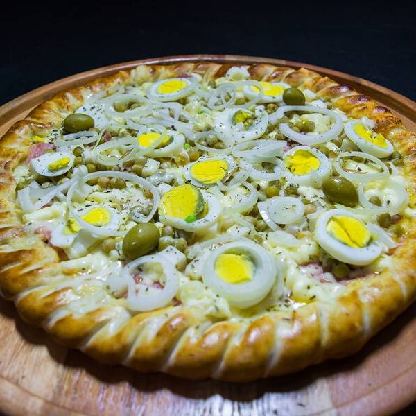Molho de tomate, mussarela, presunto, ervilha, palmito, ovo, cebola, orégano e azeitonas*** temos também de 4 e 12 pedaços, desça o cardápio e confira***