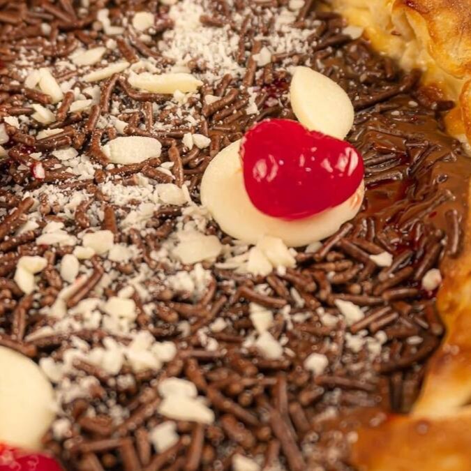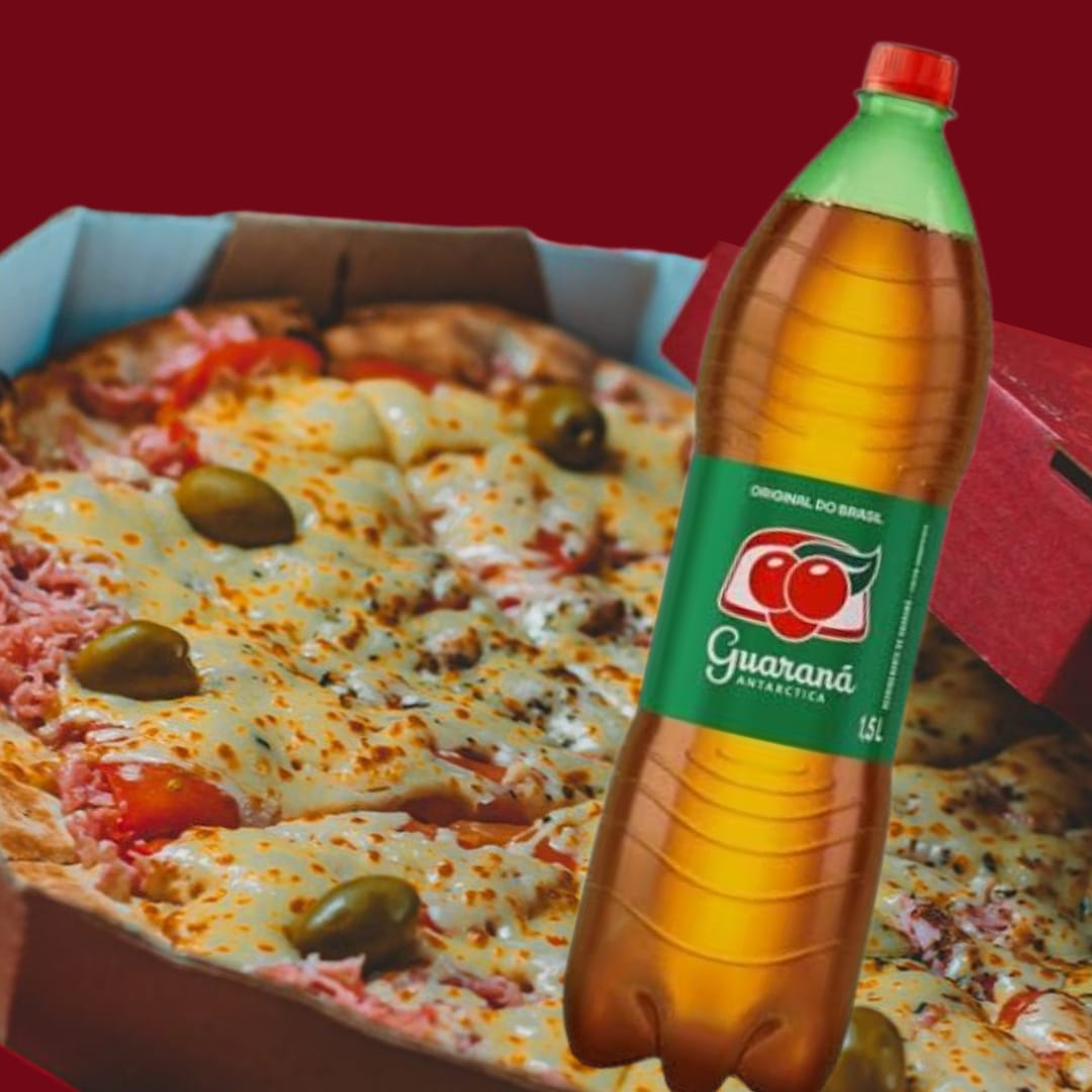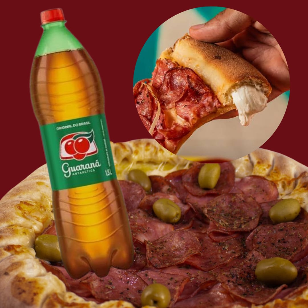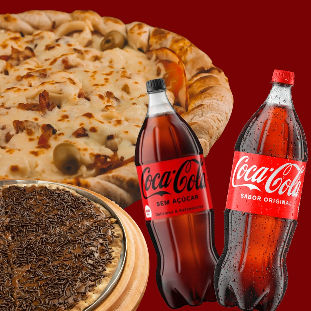1 Pizza Grande Sabor Boníssima(molho de tomate, peito de peru, catupiry, tomate, bacon, palmito, mussarela, orégano e azeitonas verdes)+1 Broto De Brigadeiro+1 Refrigerante 2 Litros