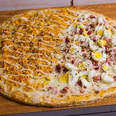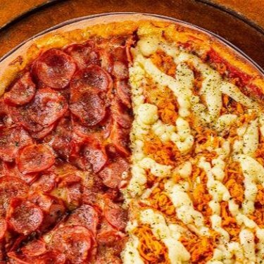 Pizza grande (35cm) 8 fatias metade calabresa com mussarela e metade frango, mussarela e Catupiry.