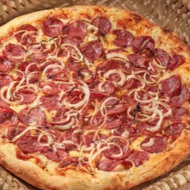 Pizza grande (8 fatias) metade calabresa, queijo mussarela, cebola em rodelas e metade queijo mussarela.(Todos as nossas pizzas são feitas com massa fresca de longa fermentação e molho de tomate artesanal feito aqui, no padrão