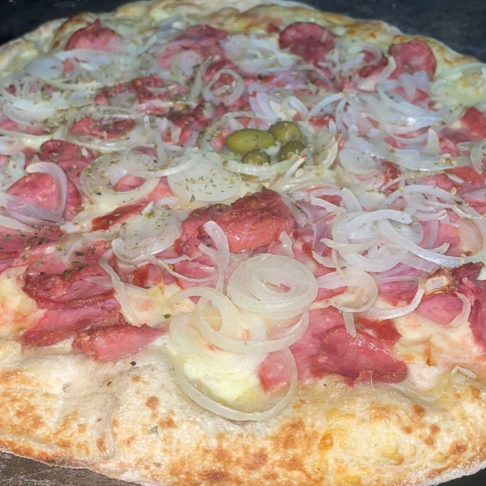 Nosso delicioso molho de tomate caseiro, salame italiano, provolone, nosso delicioso requeijão, azeitonas, queijo parmesão e uma pitada de orégano.