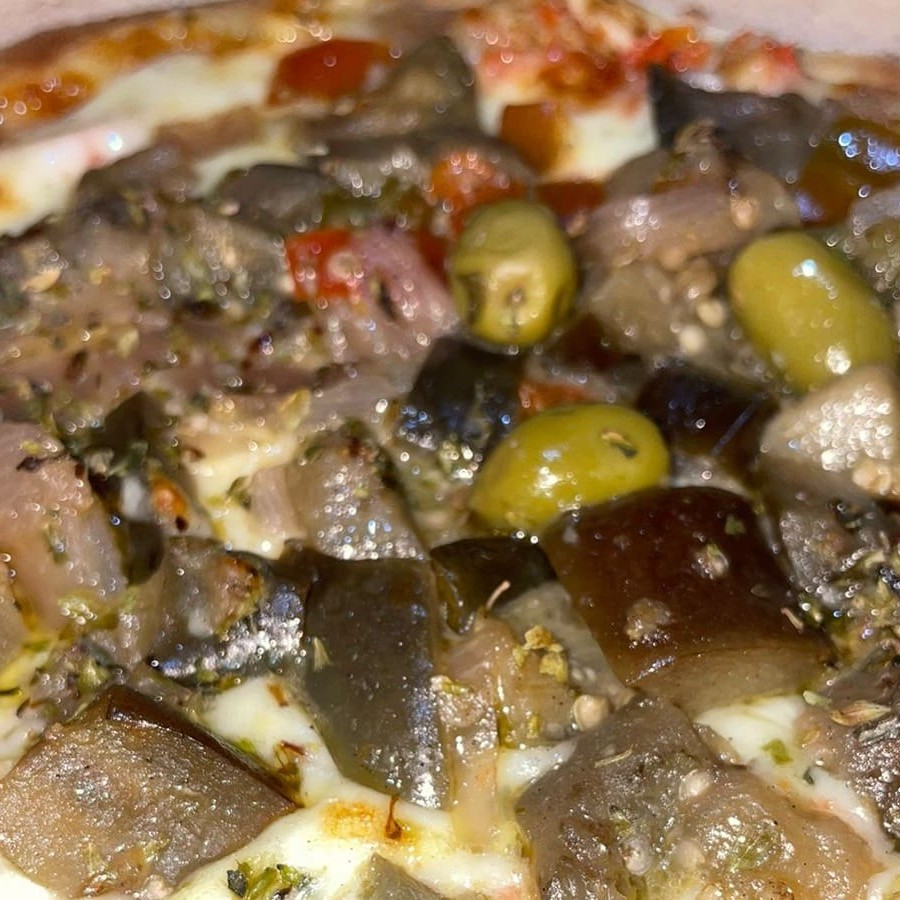 Molho de tomate, mussarela, berinjela, azeitona e orégano.