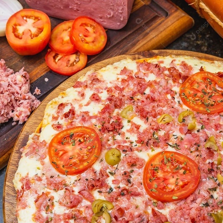 Molho de tomate, mussarela, presunto moído, tomate em rodelas, orégano e azeitona.