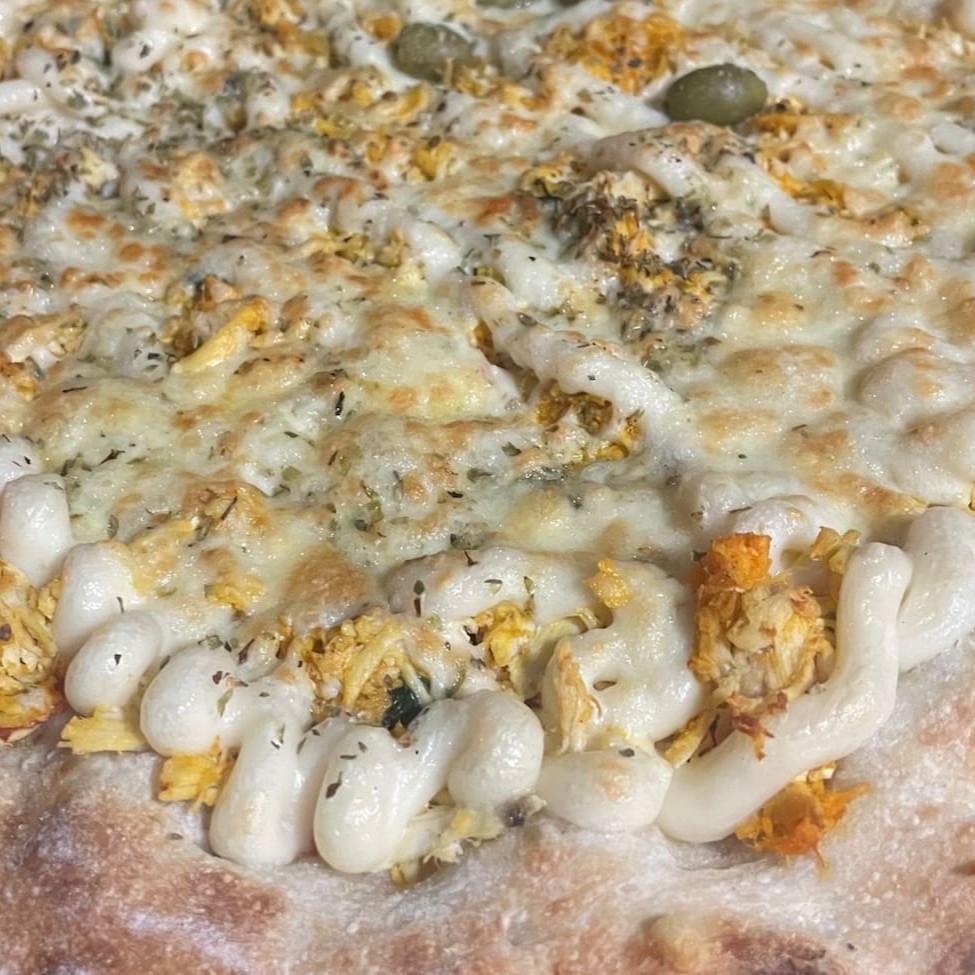 Nosso delicioso molho de tomate caseiro, a deliciosa mussarela, atum sólido, nosso delicioso requeijão (sem amido), milho verde, bacon, azeitonas e uma pitada de orégano.