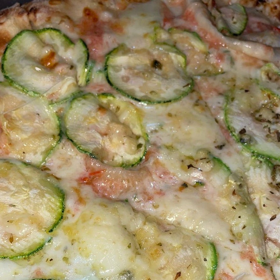 Molho de tomate, mussarela, abobrinha fatiada, queijo parmesão e orégano.