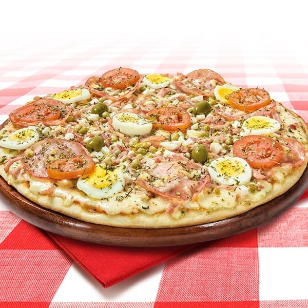 Nosso delicioso molho de tomate caseiro, a deliciosa mussarela, linguiça calabresa, presunto moído, rodelas de tomate, ervilhas, ovos, palmito, cebola cobertura de mussarela, azeitonas e uma pitada de orégano.