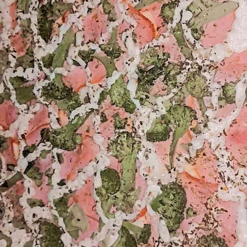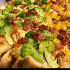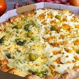 Pizza de frango com Catupiry e meia brócolis com mussarela molho de tomate frango fresco com Catupiry e mussarela brócolis com mussarela azeitona e orégano. 8 pedaços