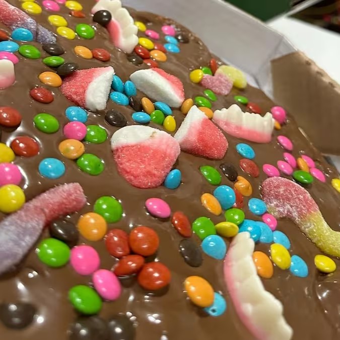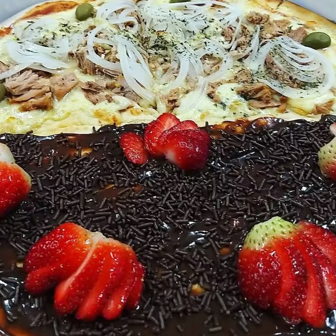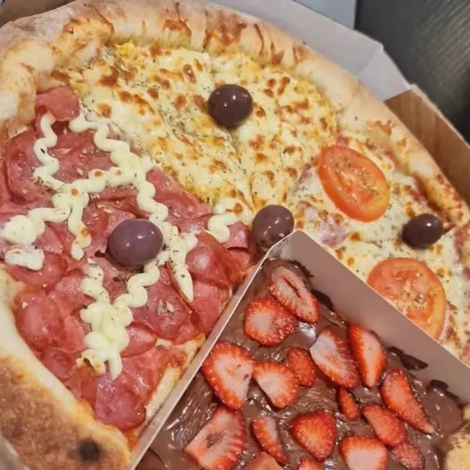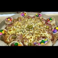 Pizza de calabresa com mussarela azeitona e orégano e borda vulcão de chocolate com Confete 8.pedacos
