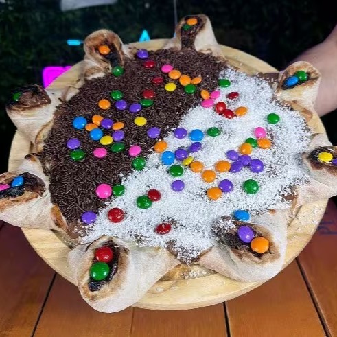 Pizza De Calabresa Com Mussarela Azeitona E Orégano E Borda Vulcão De Chocolate Com Confete 8.pedacos