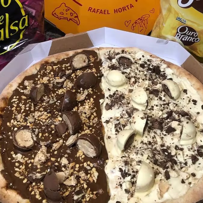 Pizza Sonho de Valsa 4 pedaços chocolate ao leite e Sonho de Valsa cortado por cima hem recheada bem caprichada