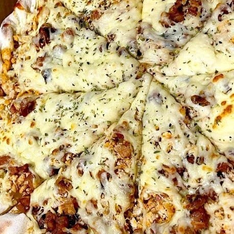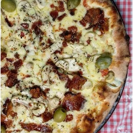 Pizza De Franco Com Bacon Molho De tomate Frango Fresco Desfiado Bacon Muita Mussarela Azeitona E Orégano. 8 pedaços