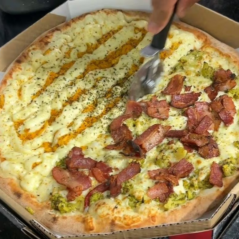 Pizza Com Borda Vulcão De Requeijao Cheder E Metade Catubacon Com Cebola E Outra Metade Palmito Milho Bacon E Mussarela Por Cima Toda Bem Derretida