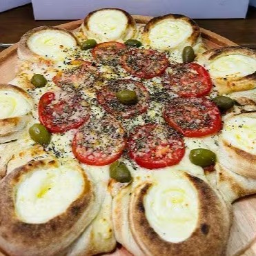 Pizza Vulcão De Mussarela E Toamte E Orégano Caprichada Bem Recheada Azeitona Molho De Tomate E Orégano Com Borda Vulcão De Requeijao 8 Pedaços
