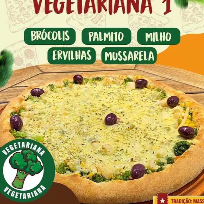 Pizza Vegetariana brócolis palmito milho ervilha champion e mussarela 8 pedaços
