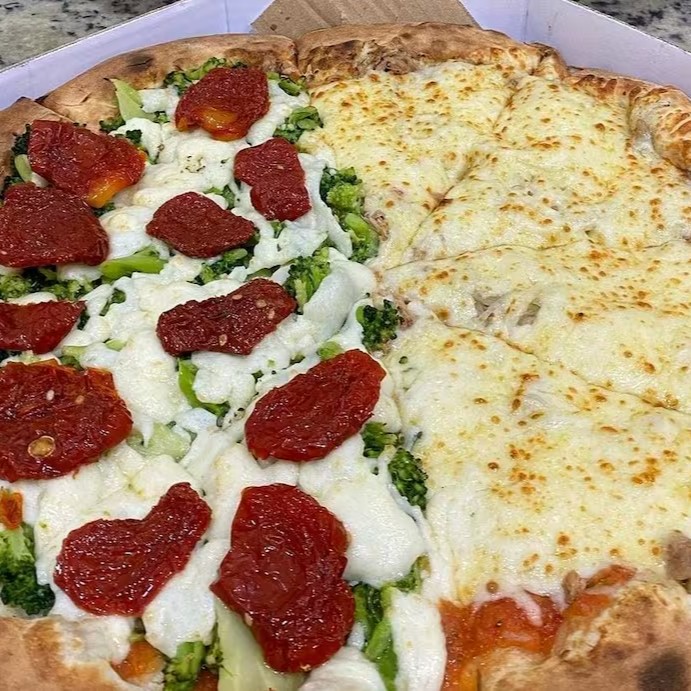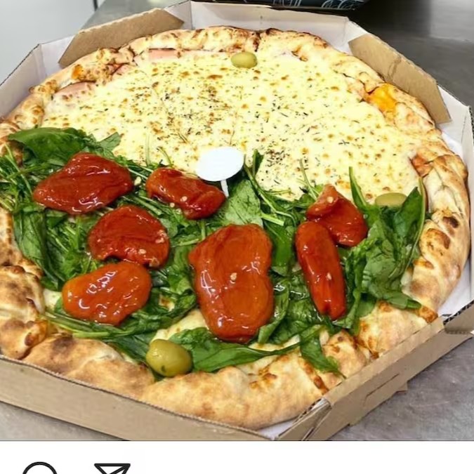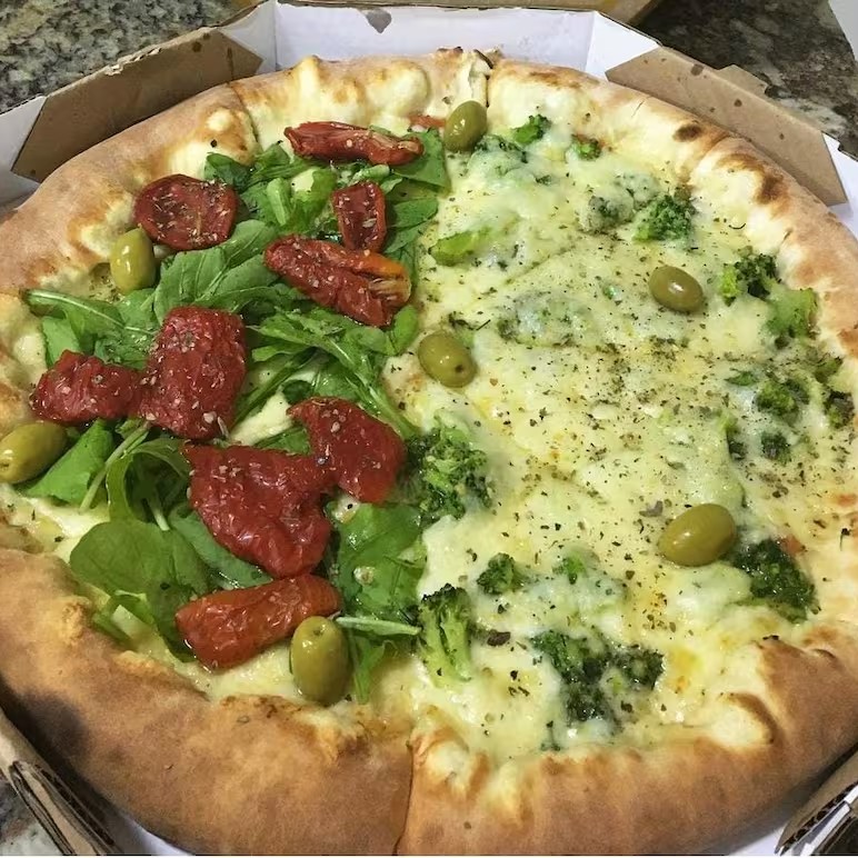 Pizza de brócolis com Catupiry mussarela tomate seco e metade peruana atum ovo cebola e requeijao mussarela é s